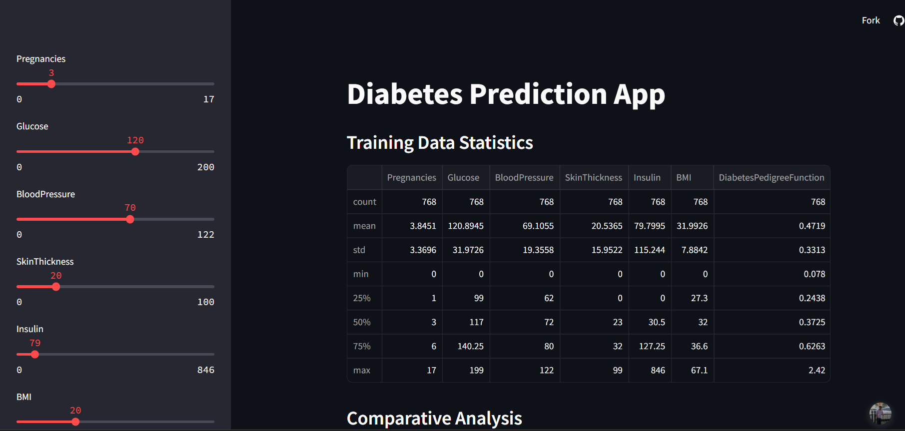 The Diabetes Checkup Application predicts diabetes based on user-inputted health data using a trained Random Forest Classifier. Users can enter key health metrics such as glucose levels, blood pressure, and BMI, while the app provides predictions, statistical insights, and visual comparisons with training data. It also displays model accuracy to ensure reliable results.